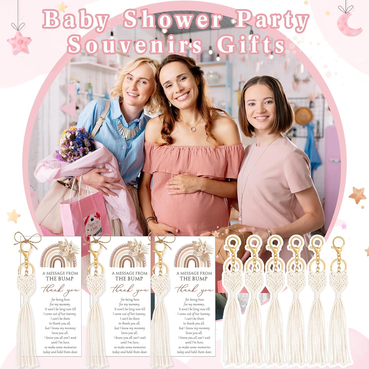 Features: Easy to match: Featuring a versatile beige color and boho style, these macrame keychains are easy to match with various outfits. You can effortlessly pair them with your favorite handbag, clutch, or keys. Portable and lightweight: Designed to be compact, these keychain thank you baby shower gifts make for an easy to carry style statement. Despite being lightweight, they are robust and durable, making them the ideal accessory for your daily routine. Specifications: Main material: Baby shower macrame bulk keychains: cotton rope Thank you card: 250G coated paper Color: as shown in pictures Size: Boho keychain: 5.91 inches/ 15 cm in length Card: about 3.54 x 7.09 inches/ 9 x 18 cm Rope: about 65.62 ft/ 20 m Package includes: 48 x Macrame keychains 48 x Thank you cards 1 x Rope Notes: Manual measurement, please allow slight errors on size. The color may exist a slight difference due to different screen displays. Winding risk may exist, please keep our product away from children.